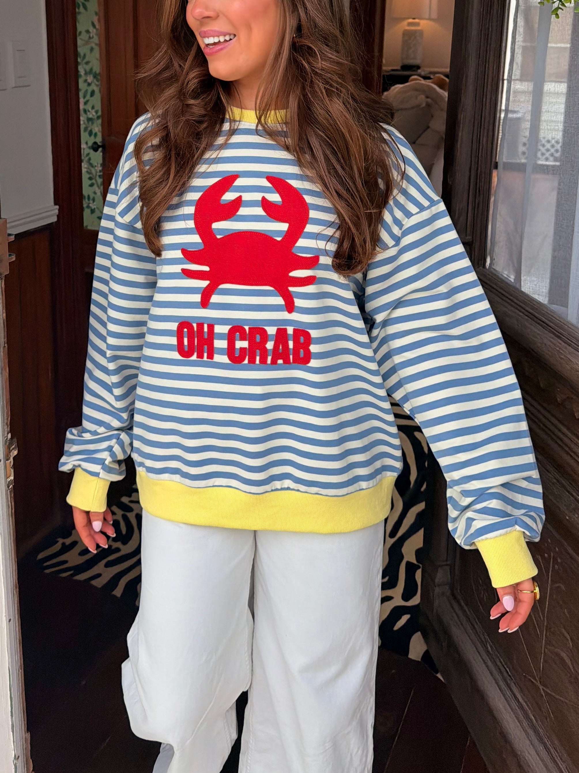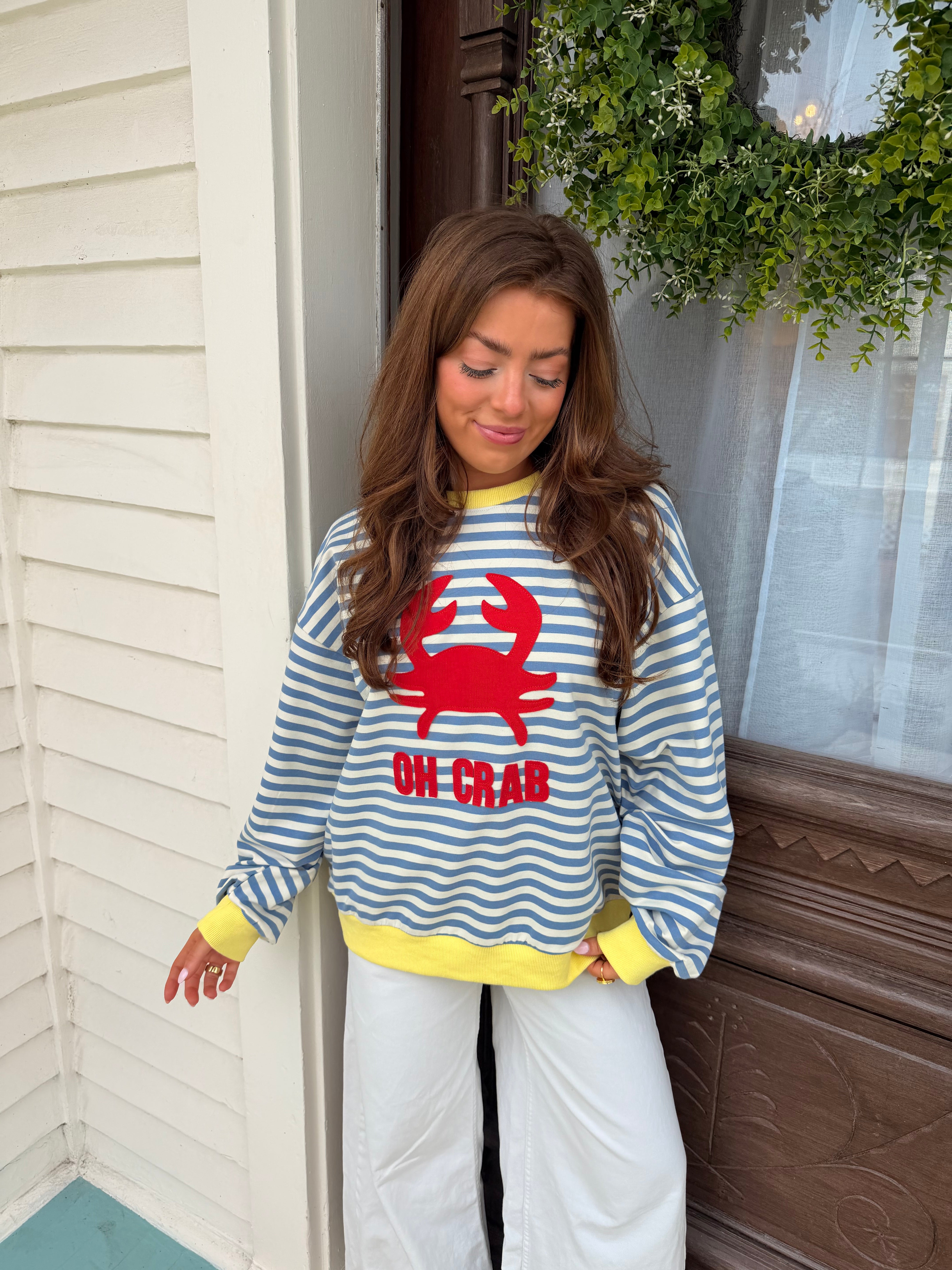 How cute is this crewneck! The quality is the perfect amount of thickness with the right amount of soft! Who doesn't love a perfectly oversized crew. Throw this over your shoulders at the beach or throw it on if you just love crabs!!